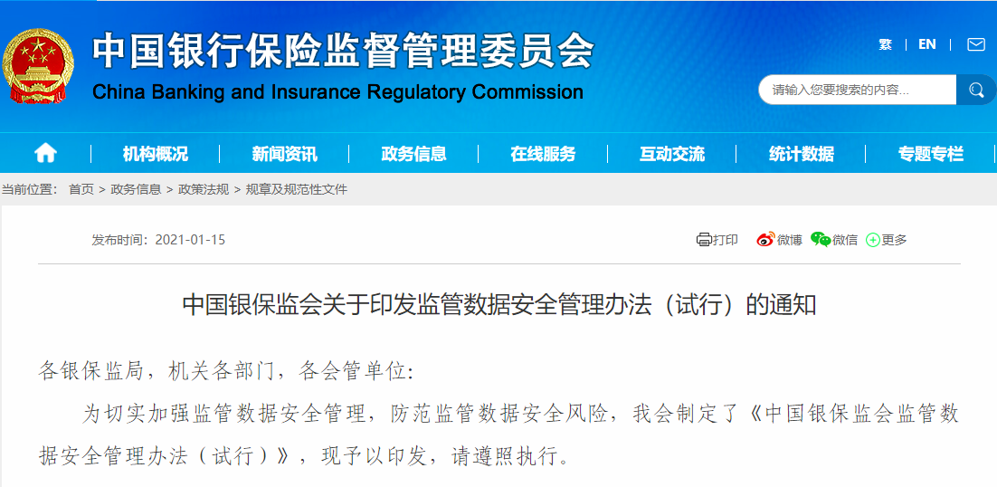 中國銀保監(jiān)會監(jiān)管數(shù)據(jù)安全管理辦法